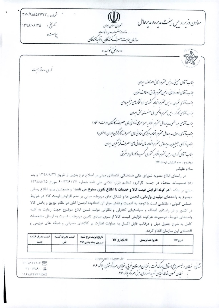 ممنوعيت هرگونه افزايش قيمت کالا و خدمات تا اطلاع ثانوي